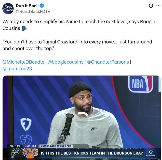 同為內線球員的考辛斯則表示文班亞馬已經到了“少就是多”的階段,他完全不必每次進攻都像克勞福德那樣花哨,文班的下一個課題是簡化比賽方式。