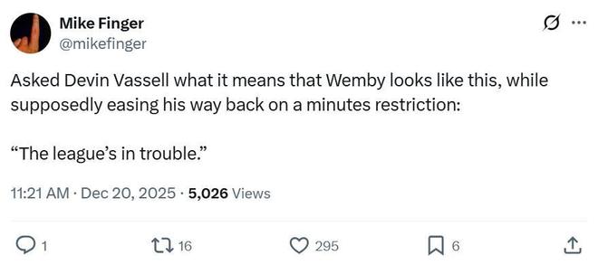 面對文班亞馬這樣的表現,隊友瓦塞爾賽后直言:“這個聯盟有麻煩了!”